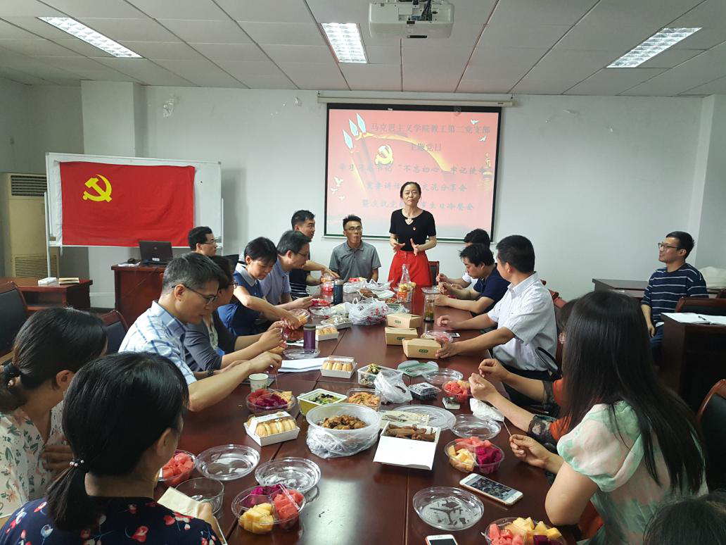 活动首先从重温入党誓词开始,在支部书记陈梅的带领下,全体党员心情激动,神情肃穆,铿锵有力地诵读共产党员的初心与使命。宣誓完毕,进入边品尝色香味纷呈的八方珍馔,边交流认真研读习总书记讲话后的学习心得议程。同志们围绕“不忘初心、牢记使命”主题教育的目标要求,重点讨论“守初心、担使命,找差距、抓落实”的总要求以及怎样牢牢把握目标任务两大方面内容。每位党员都作了经过精心准备的精彩发言,经过对每位发言人所作发言的热烈讨论,全体党员在以下几个方面形成共识:思政课教师职业的“初心”和“使命”就是“以员工为中心”,“我将无我,不负员工”,在讲台上教师要理直气壮、旗帜鲜明宣传新时代中国特色社会主义思想,对一切错误思想和言行要敢于亮剑;面对信息化时代知识面愈来愈广,综合素质愈来愈高的00后老员工,教师要放下身段,向员工学习,全方位关心员工,服务员工;中共党员已超9000万,党员的质量事关党的事业兴旺发达,当前最急迫问题是党魂建设,只有教师首先做到知信行相统一,才能在课堂上党魂教育有效果,才能引导员工相信党,跟党走;当前四门思想政治理论课共同面对的难点在于怎样让社会实践教学再上新台阶,有部分教师在此方面知识储备和经验积累不足,急需提升。