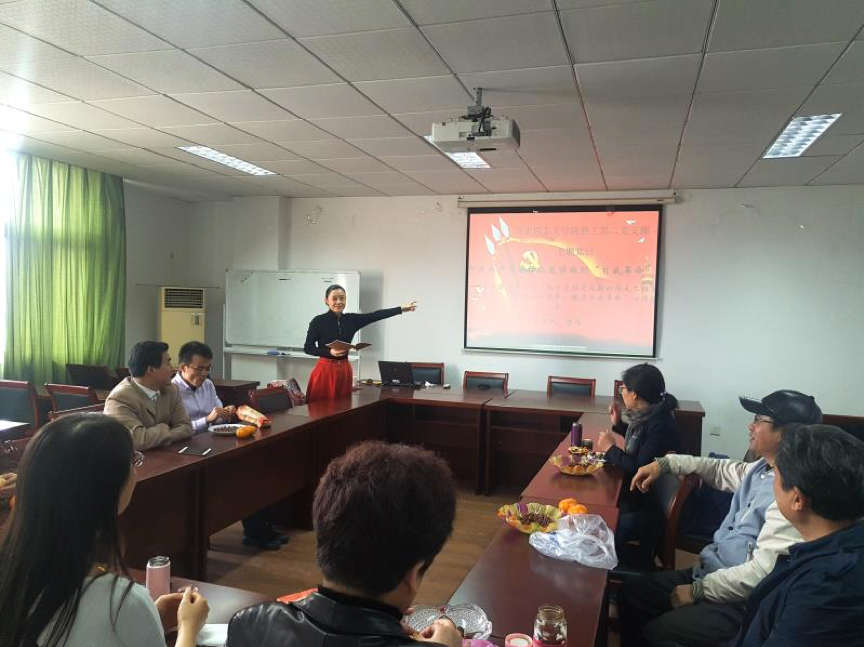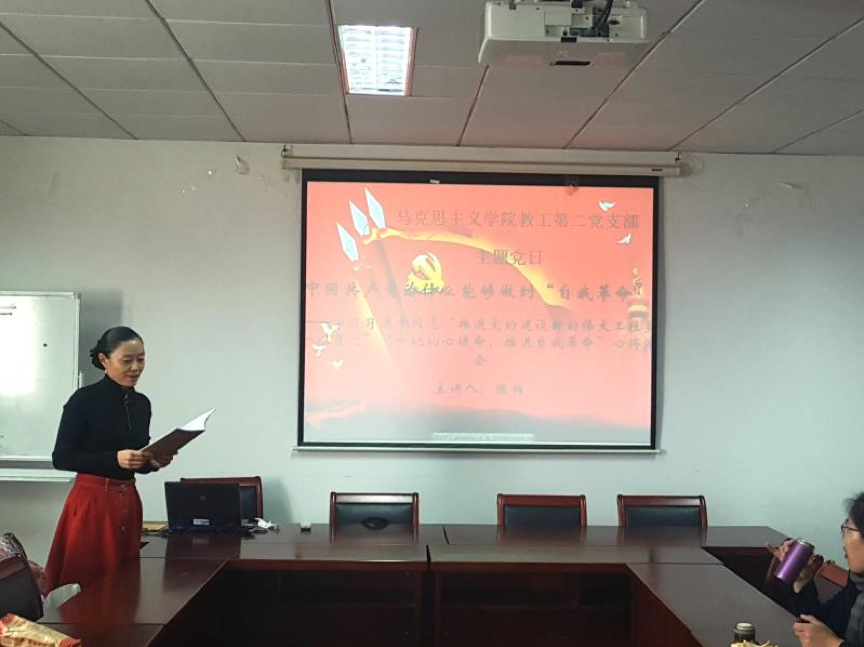 支部书记陈梅老师从党的指导思想、全心全意为人民服务的宗旨、党的核心领导层伟人辈出、走群众路线问计于民、自我革命不追求一蹴而就急于求成、自信而不自恋等6个方面谈了学习体会。这次党课,不仅增强了全体党员对中国共产党执政的信心,提升了支部每个党员自身的政治理论水平,坚定了每个党员全心全意为人民服务的信心和决心,而且全体党员也深刻的认识到,要做到不忘初心牢记使命,必须要有强烈的自我革命精神,并把这种精神贯穿到在日常生活工作学习中去,特别是思政课教学改革创新中去,使公司教学科研工作再上新台阶。