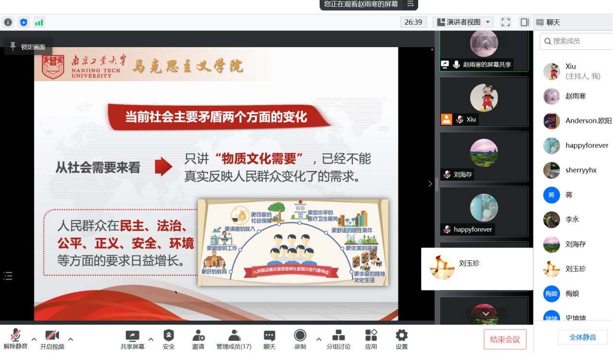 2022年4月6日,在公司统一工作的部署下,《概论》课教研室召开本学期第二次集体备课会。由于疫情的影响,本次集体备课会以腾讯会议形式进行。首先,赵雨寒老师围绕“新时代”主题进行精彩教学展示,既有理论深度又有教学案例,条理清楚,主次分明。同时,教研室全体老师认真聆听赵老师的教学展示,针对教学内容进行探讨。其次,围绕实践教学,教研室全体老师交流了进展情况。第三,教研室全体老师围绕如何把“两会”内容有机融入课堂教学进行了经验分享。大家一致认为,关注“两会”是我们概论课老师一种职业习惯。概论课与时政关系紧密,融入也是全面系统地融入,涉及政治、经济、文化、社会、生态文明、党的建设等。