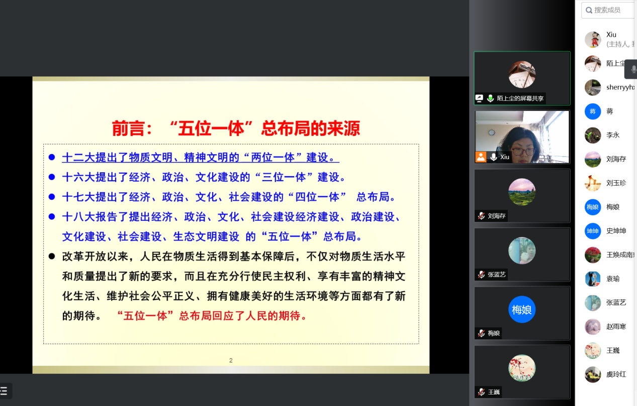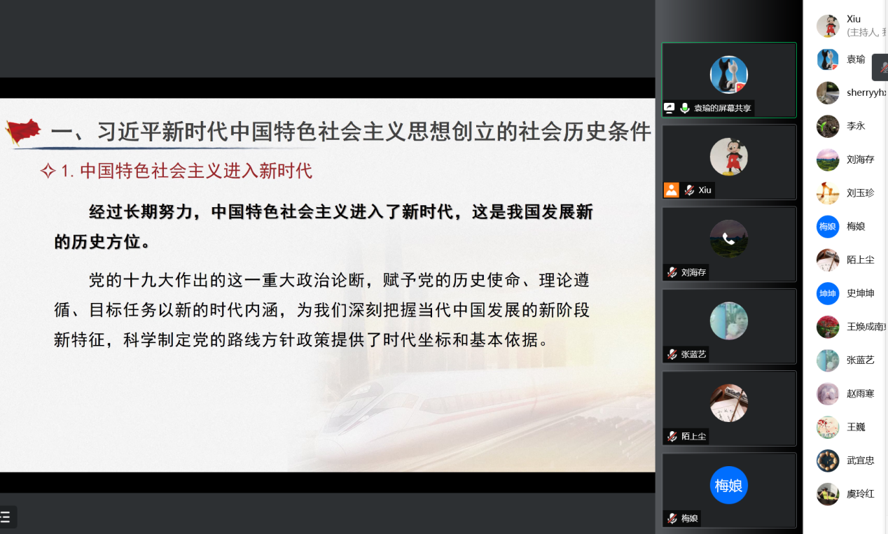 2022年4月20日,在公司统一工作的部署下,《概论》课教研室召开本学期第三次集体备课会。由于疫情的影响,本次集体备课会以腾讯会议形式进行。本次集体备课会包括两个环节:首先,钱静珠和袁瑜两位老师分别围绕“‘五位一体’之经济建设”、“新时代”主题进行教学展示。接着,教研室老师进行点评及分享教学体会。陈梅老师认为,两位老师课件做得好,内容丰富、逻辑清晰、重点突出、富有美感。同时,陈老师分享了自己的教学经验,要善于理论联系现实,尤其是在教学导入环节要善于抛出现实问题以吸引员工,在讲深讲透理论的同时,注意员工抬头率。王焕成老师认为,两位老师能够注重教学内容的前后衔接,注重教学目标,善于运用教材资源。李永老师认为,两位老师教学精神状态好,教学流程规范。同时也提出建议,要善于运用“两点论”和重点论,要重视每章的导语部分教学。王巍老师建议在教材基础上可以适当扩展理论视域,以增加课堂教学的理论广度。史坤坤老师也分享了自己的教学经验,在理论教学时多引用马克思的相关论述,以增强课堂教学的理论厚度。教研室其他老师也都分享了自己的教学感受。