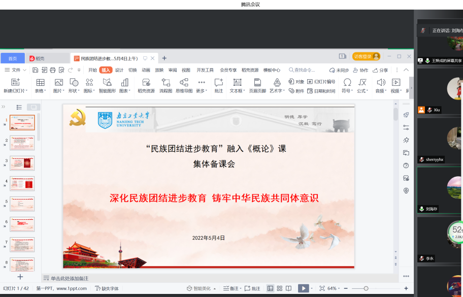 2022年5月4日,在公司的统一工作部署下,《概论》课教研室召开了本学期第四次集体备课会。校统战部与教研室联合推进民族团结进步教育融入《概论》课堂。为了提高教学质量,校统战部张伊桐参加了本次集体备课会。本次集体备课会包括两个环节:首先,教研室主任围绕“深化民族团结进步教育,铸牢中华民族共同体意识”主题进行教学说明和教学重难点。接着,教研室老师发扬教研室群策群力传统,分享教学观点和方法。王巍老师以文化视角诠释了中华民族共同体这一核心概念。虞玲红老师认为,中华民族共同体不仅仅是一个抽象的文化或历史的概念,更是一个具体的存在,可以从物质生活条件的变化,尤其是边远地区的少数民族的社会生活条件的变化来理解中华民族共同体的意义。此外王焕成、李永等老师也分享了各自的教学观点。