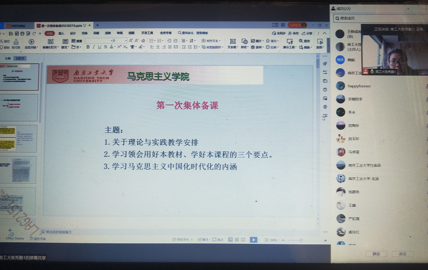 在公司统一工作部署下,2023年2月19日,《概论》课教研室召开本学期第一次集体备课会。本次集体备课会以腾讯会议形式进行,包括三个主题:1.关于本课程的理论与实践教学安排;2.学习领会用好本教材、学好本课程的三个要点;3.学习马克思主义中国化时代化的内涵。任课教师积极参与了主题讨论。概论课教研室老师以及任本课程的《四史》教研室老师参与本次集体备课。