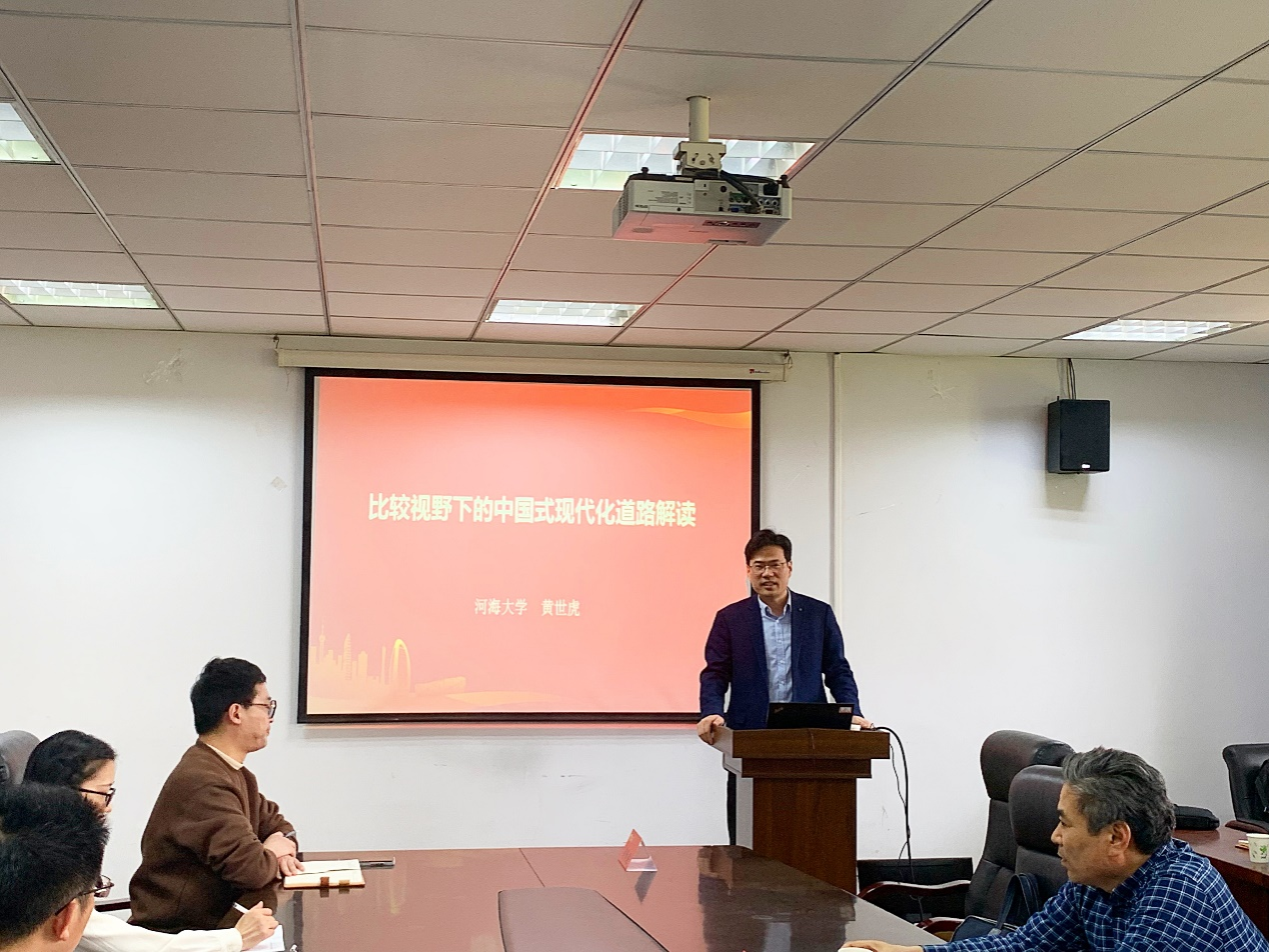随后,黄教授给大家带来了《比较视野下的中国式现代化道路解读》专题学术讲座。黄教授从近代中国开启现代化进程、发展中国家探索现代化和中国式现代化超越西方现代化三部分展开:19世纪60年代中国内忧外患引发政权危机而被迫开启现代化,紧接着比较近代中国与拉美模式的现代化主要特征,指出其存在一定的局限性。中国共产党选择了马克思主义,在中国式现代化的实践中,实现了经济模式与政治模式的双重超越。中国式现代化是中国共产党领导的社会主义现代化,既有各国现代化的共同特征,更有基于自己国情的中国特色,中国式现代化道路的提出,不仅具有历史意义,而且具有世界意义,黄教授建议青年学者要从一般性中理解现代化的普遍本质,在特殊性中把握中国式现代化的本质属性。