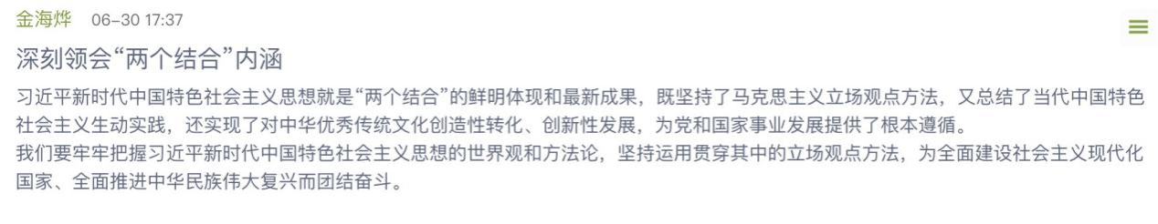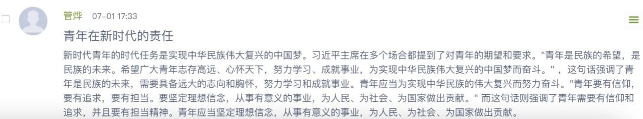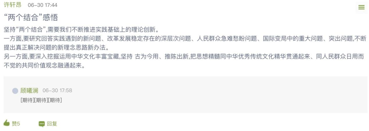 此次展览一经发布,便引来本校各公司大批员工踊跃参与,他们积极点赞、留言,好评如潮。王娜同学说,“作为青年,我们要坚持深刻领会习近平新时代中国特色社会主义思想,坚持将青年命运与国家命运连在一起。”金海烨同学说,“我们要牢牢把握习近平新时代中国特色社会主义思想的世界观和方法论,坚持运用贯穿其中的立场观点方法,为全面建设社会主义现代化国家、全面推进中华民族伟大复兴而团结奋斗。”饶凯同学说,“领会‘两个结合’,以党的信仰感召青年的感悟,是一种使青年群体获得信仰力量、激发潜能并投身党和国家事业的重要途径。”