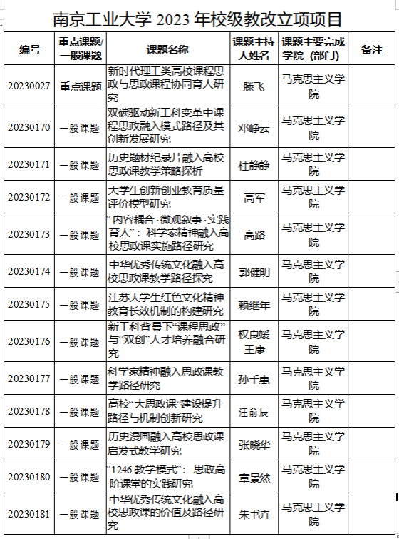 2023年9月28日,教务处发布了《关于公布2023年校级教改课题立项项目暨省级教改课题推荐项目遴选结果的通知》,公司报送的16项课题中,13项获2023年校级教改研究课题立项。其中,滕飞老师的《新时代理工类高校课程思政与思政课程协同育人研究》立项为重点课题,邓峥云老师的《双碳驱动新工科变革中课程思政融入模式路径及其创新发展研究》等12项课题立项为一般课题。