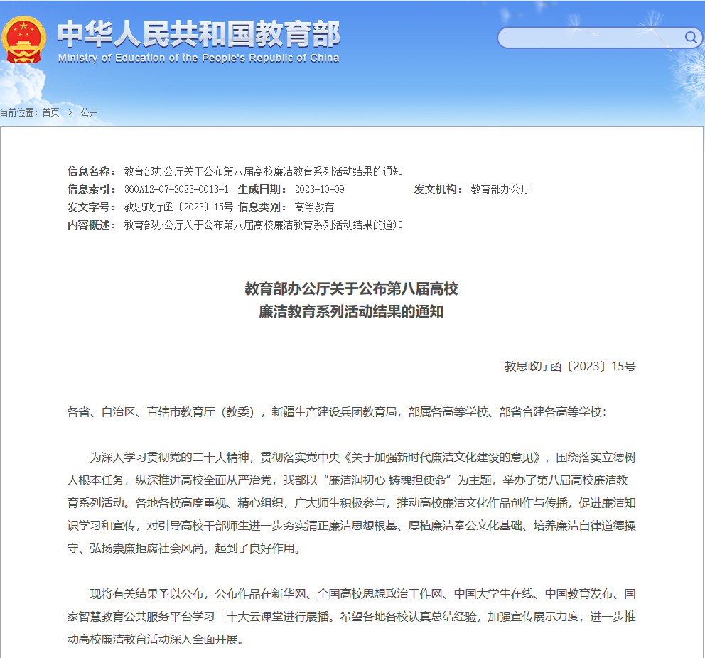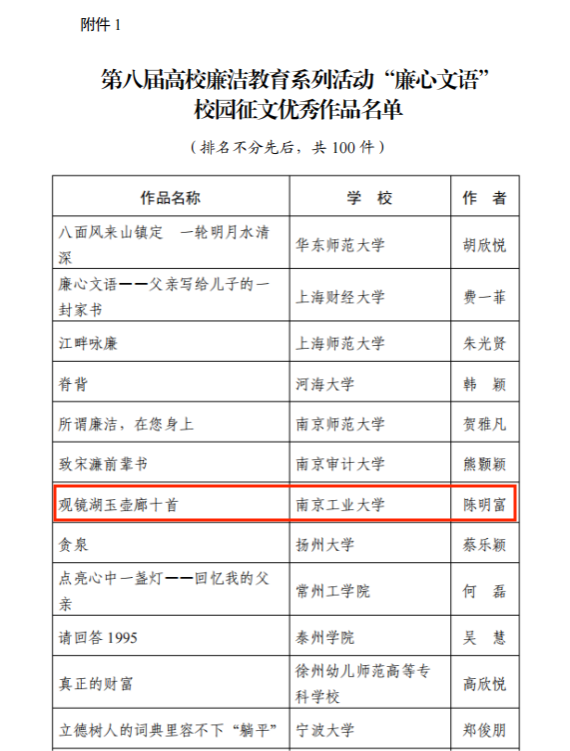 近日,由教育部思政司主办的“廉洁润初心 铸魂担使命——第八届高校廉洁教育系列活动”评选结果公布,公司陈明富老师的诗作《观镜湖玉壶廊十首》获评全国高校“廉心文语”校园征文优秀作品奖(江苏省共8件)。