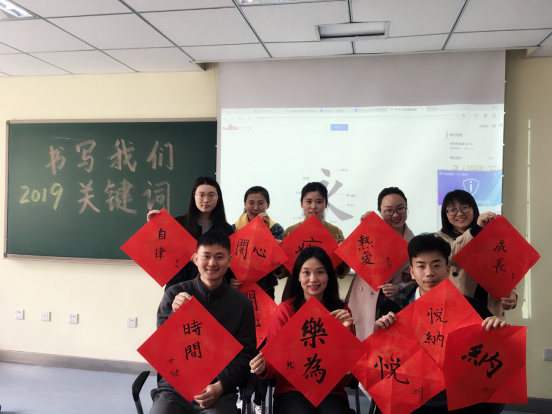陶然副经理还特别准备了笔墨纸砚,为同学们简要介绍了书法的发展以及用笔方法。大家跟随着陶老师练习了“永”字八法,既体会到书法的博大精深,又感慨需要勤加练习。经过近一个半小时的练习,同学们完成了自己的书法“首秀”,在红红的“福”字纸上写下了2019年的关键词,也寓意着下定决心,按着关键词做,做到关键词。